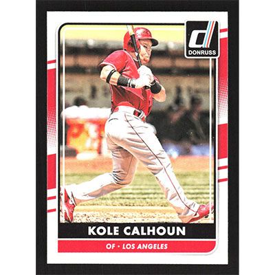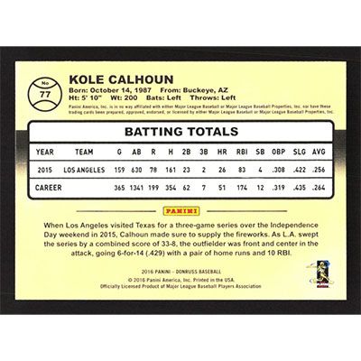 This is a 2016 Donruss Kole Calhoun baseball card. The card is #77 and pictures show condition.