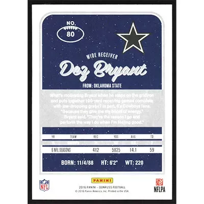 This is a 2016 Donruss Dez Bryant football card. The card is #80 and pictures show condition.