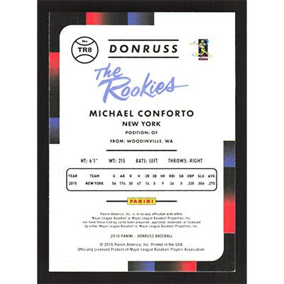 This is a 2016 Donruss The Rookies Michael Conforto baseball card. The card is #TR8 and pictures show condition.