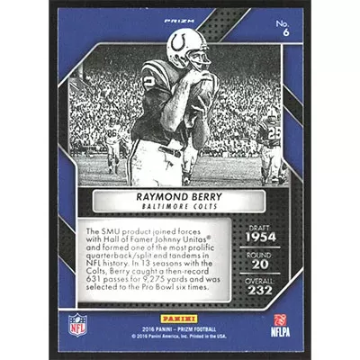 This is a 2016 Panini Prizm Draft Gems Silver Raymond Berry football card. The card is #6 and pictures show condition.