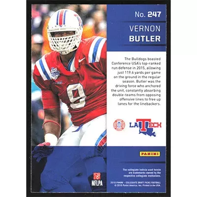 This is a 2016 Panini Prizm Draft Picks Vernon Butler football card. The card is #247 and pictures show condition. Team(s): Louisiana Tech Bulldogs Rookie Card (RC)