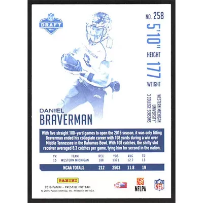 This is a 2016 Prestige Daniel Braverman football card. The card is #258 and pictures show condition.