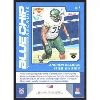 This is a 2016 Prestige Blue Chip Recruits Andrew Billings football card. The card is #2 and pictures show condition.