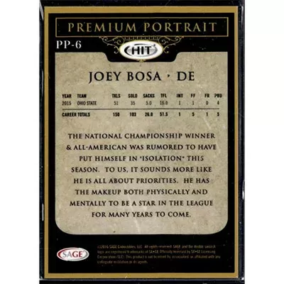 This is a 2016 SAGE HIT Premium Portrait Gold Joey Bosa football card. The card is #PP-6 and pictures show condition.