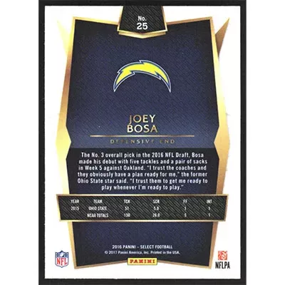 This is a 2016 Select Joey Bosa football card. The card is #25 and pictures show condition.