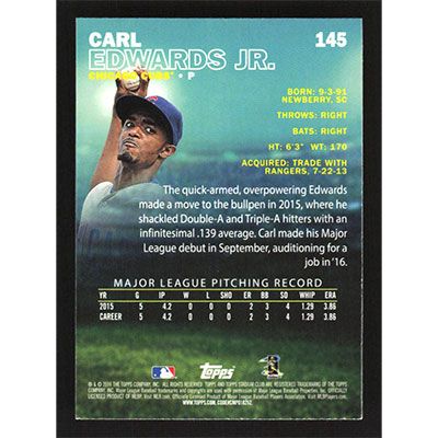 This is a 2016 Stadium Club Black Carl Edwards Jr. baseball card. The card is #145 and pictures show condition.