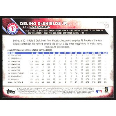 This is a 2016 Topps Delino DeShields Jr. Future Stars baseball card. The card is #19 and pictures show condition.
