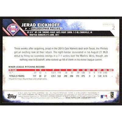 This is a 2016 Topps Jerad Eickhoff baseball card. The card is #2 and pictures show condition.