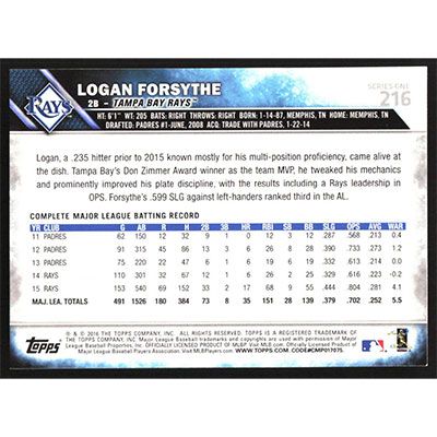 This is a 2016 Topps Logan Forsythe baseball card. The card is #216 and pictures show condition.
