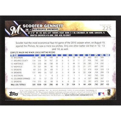 This is a 2016 Topps Scooter Gennett baseball card. The card is #225 and pictures show condition.