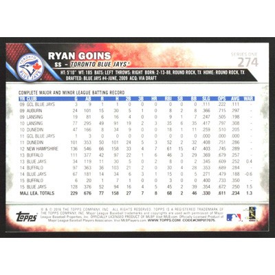 This is a 2016 Topps Ryan Goins baseball card. The card is #274 and pictures show condition.