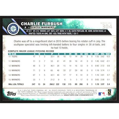 This is a 2016 Topps Charlie Furbush baseball card. The card is #304 and pictures show condition.