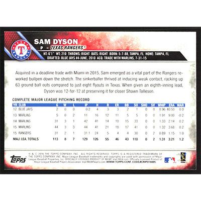 This is a 2016 Topps Sam Dyson baseball card. The card is #389 and pictures show condition.