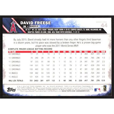 This is a 2016 Topps David Freese baseball card. The card is #44 and pictures show condition.
