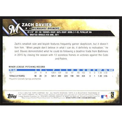 This is a 2016 Topps Zach Davies baseball card. The card is #581 and pictures show condition.