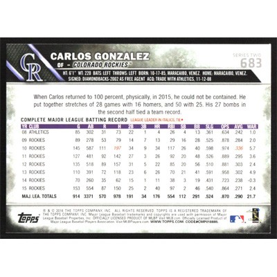 This is a 2016 Topps Carlos Gonzalez baseball card. The card is #683 and pictures show condition.