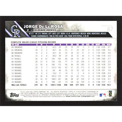 This is a 2016 Topps Jorge De La Rosa baseball card. The card is #87 and pictures show condition.