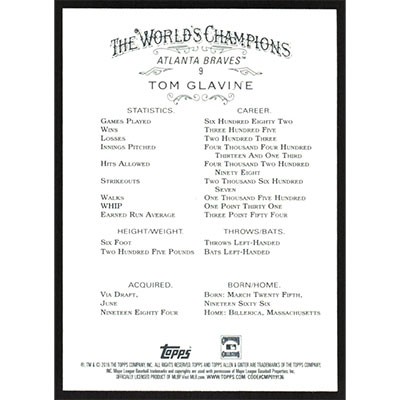 This is a 2016 Topps Allen & Ginter Tom Glavine baseball card. The card is #9 and pictures show condition.