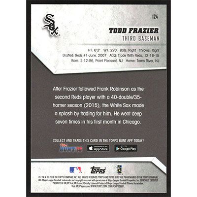 This is a 2016 Topps Bunt Todd Frazier baseball card. The card is #124 and pictures show condition.