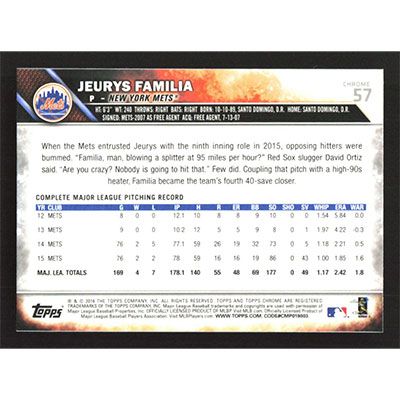 This is a 2016 Topps Chrome Jeurys Familia baseball card. The card is #57 and pictures show condition.