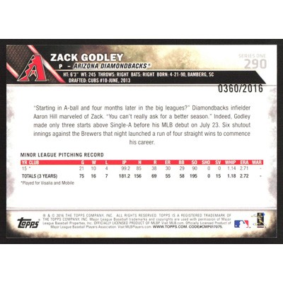 This is a 2016 Topps Gold Zack Godley baseball card. The card is #290 and pictures show condition. This card is limited; #'d 0360/2016. Team(s): Arizona Diamondbacks Rookie Card (RC)
