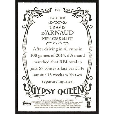 This is a 2016 Topps Gypsy Queen Travis d'Arnaud baseball card. The card is #172 and pictures show condition.