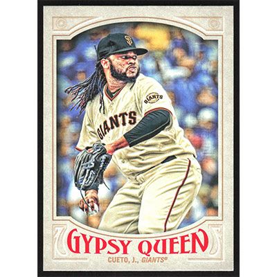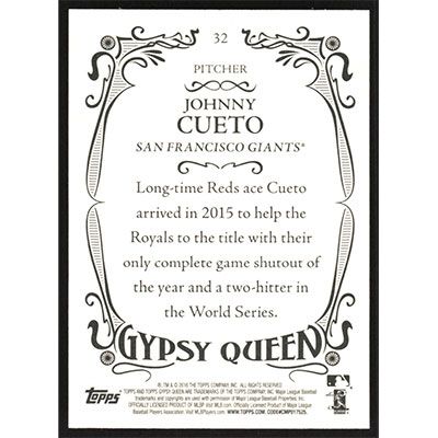 This is a 2016 Topps Gypsy Queen Johnny Cueto baseball card. The card is #32 and pictures show condition.