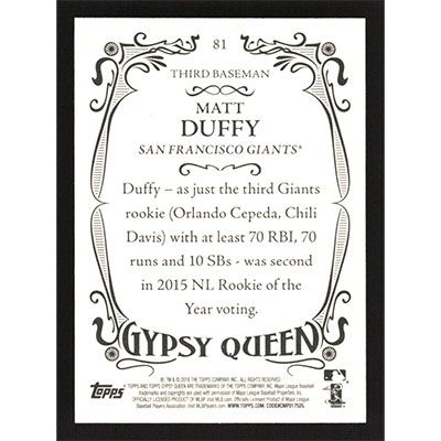 This is a 2016 Topps Gypsy Queen Matt Duffy autographed baseball card. This card has been signed, in blue, by Matt Duffy, and is guaranteed authentic by Ballcardz.com. The card is #81 and pictures show condition.