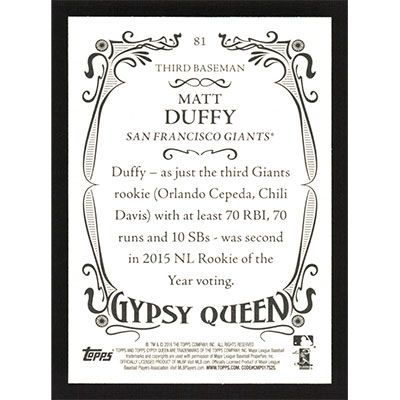 This is a 2016 Topps Gypsy Queen Matt Duffy baseball card. The card is #81 and pictures show condition. Team(s): San Francisco Giants Rookie Card (RC)
