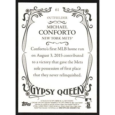 This is a 2016 Topps Gypsy Queen Framed Blue Michael Conforto baseball card. The card is #61 and pictures show condition. Team(s): New York Mets Rookie Card (RC)