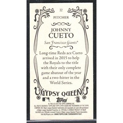 This is a 2016 Topps Gypsy Queen Mini Johnny Cueto baseball card. The card is #32 and pictures show condition.