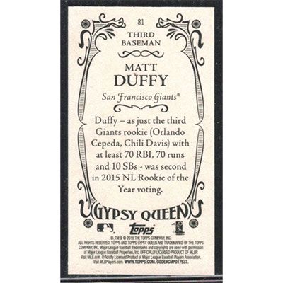 This is a 2016 Topps Gypsy Queen Mini Matt Duffy baseball card. The card is #81 and pictures show condition. Team(s): San Francisco Giants Rookie Card (RC)
