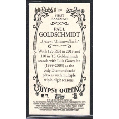This is a 2016 Topps Gypsy Queen Mini Purple Paul Goldschmidt baseball card. The card is #160 and pictures show condition. This card is limited; #'d 107/250.
