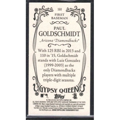 This is a 2016 Topps Gypsy Queen Mini Variations Paul Goldschmidt baseball card. The card is #160 and pictures show condition. Team(s): Arizona Diamondbacks