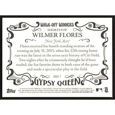 This is a 2016 Topps Gypsy Queen Walk-Off Winners Wilmer Flores baseball card. The card is #GWO-7 and pictures show condition.