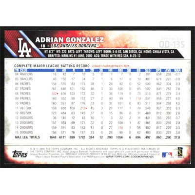 This is a 2016 Topps Opening Day Blue Foil Adrian Gonzalez baseball card. The card is #OD-135 and pictures show condition.