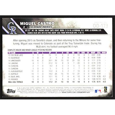 This is a 2016 Topps Opening Day Blue Foil Miguel Castro baseball card. The card is #OD-173 and pictures show condition.