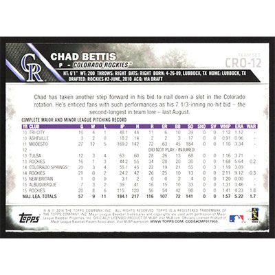 This is a 2016 Topps Rockies Chad Bettis baseball card. The card is #CRO-12 and pictures show condition.
