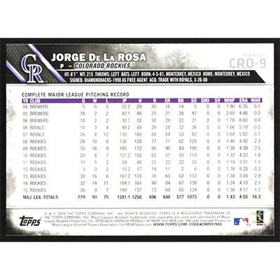 This is a 2016 Topps Team Sets Jorge De La Rosa baseball card. The card is #CRO-9 and pictures show condition.