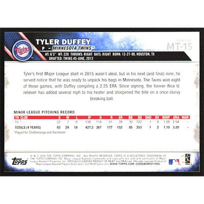 This is a 2016 Topps Team Sets Tyler Duffey baseball card. The card is #MT-15 and pictures show condition.