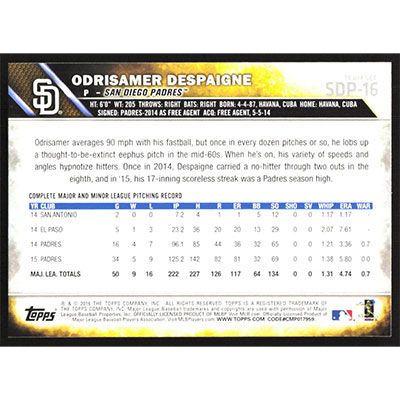 This is a 2016 Topps Team Sets Odrisamer Despaigne baseball card. The card is #SDP-16 and pictures show condition.