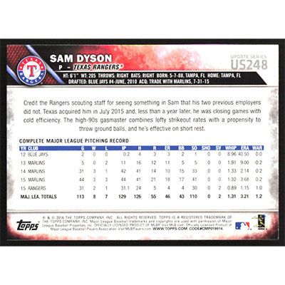 This is a 2016 Topps Update Sam Dyson baseball card. The card is #US248 and pictures show condition.