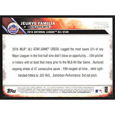 This is a 2016 Topps Jeurys Familia All-Star baseball card. The card is #US296 and pictures show condition.