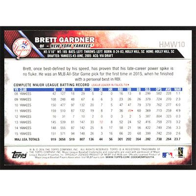 This is a 2016 Topps Wal-Mart Holiday Snowflake Brett Gardner baseball card. The card is #HMW10 and pictures show condition.