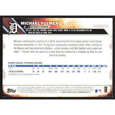 This is a 2016 Topps Wal-Mart Holiday Snowflake Michael Fulmer baseball card. The card is #HMW34 and pictures show condition. Team(s): Detroit Tigers Rookie Card (RC)