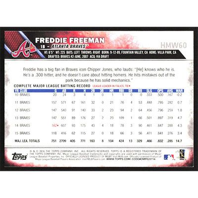 This is a 2016 Topps Wal-Mart Holiday Snowflake Freddie Freeman baseball card. The card is #HMW60 and pictures show condition.