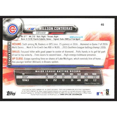 This is a 2017 Bowman Willson Contreras baseball card. The card is #46 and pictures show condition.