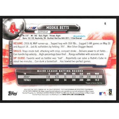 This is a 2017 Bowman Mookie Betts baseball card. The card is #6 and pictures show condition.