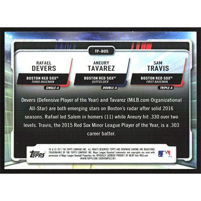 This is a 2017 Bowman Chrome Talent Pipeline Refractors Rafael Devers, Aneury Tavarez and Sam Travis baseball card. The card is #TP-BOS and pictures show condition.