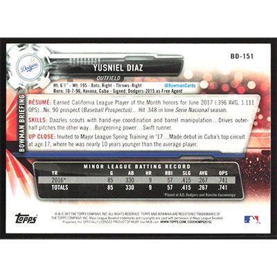 This is a 2017 Bowman Draft Yusniel Diaz autographed baseball card. This card has been signed, in blue, by Yusniel Diaz, and is guaranteed authentic by Ballcardz.com. The card is #BD-151 and pictures show condition.